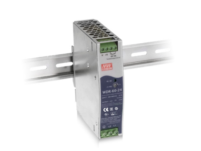 WDR-60系列是一款60W具有超宽交流输入范围的DIN轨道电源。适合安装在TS-35/7.5或TS-35/15的轨道上。主要特点有:可接受一相或两相的180~550VAC超宽输入电压范围,易于安装的DIN导轨式采用超薄设计(宽度仅32mm),-30~+85°℃宽范围工作温度,4.7KVAC高隔离电压,可在海拔5000m条件下操作,输出电压可调(最大+20%),高效率、 低纹波、低噪声、全保护等。